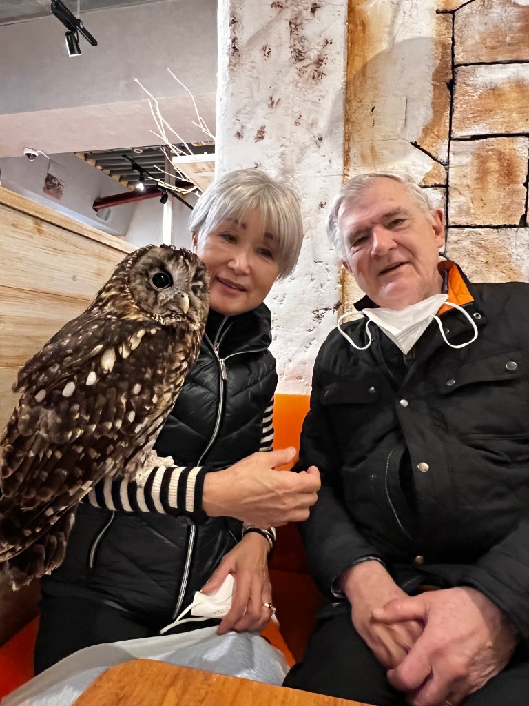 My wife and I went to the owl cafe in 2022 and 2024. I read that only two are in existence. One is in Fukuoka, and one in Tokyo. Since we were visiting my “Japanese Mama” in Fukuoka, we went there. There were about fifty owls. A couple were in cages, but most were perched on shelves around the cafe. In order to stay and meet the owls, we were required to buy a couple cups of coffee for about $18 apiece.